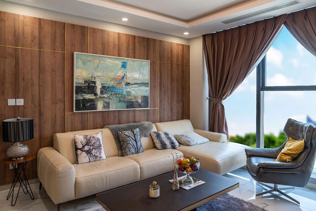 Những mảng tường thô cứng được hạn chế sử dụng để tạo ra những mặt phẳng lớn kết nối mọi không gian trong căn hộ. Khung cửa sổ phòng khách, phòng ngủ được bao phủ bởi lớp kính Low-E tân tiến loại bỏ mọi tạp âm, giúp mở rộng tầm nhìn ra thiên nhiên trong lành. Đặc biệt, loại kính cao cấp này còn có khả năng cách nhiệt, chống tia cực tím mà vẫn hấp thu được tối đa lượng ánh sáng tự nhiên. Phòng khách của căn hộ cũng được thiết kế theo phong cách tối giản trang trí cùng thảm trải sàn, tranh treo tường giúp thể hiện sự trang nhã, tinh tế rất phổ biến trong những năm gần đây.